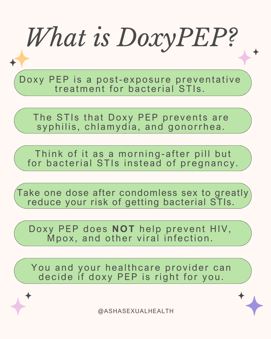 Doxy PEP is a post-exposure preventative treatment for bacterial STIs. Learn more: https://www.ashasexualhealth.org/doxy-pep-is-a-new-strategy-to-help-prevent-stis/